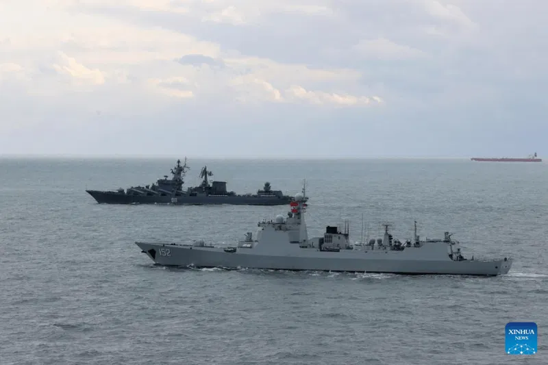 Destroyer Jinan from Chinese navy (front) and cruiser Varyag from Russian navy sail in formation after a joint naval exercise, Joint Sea 2022, in the East China Sea on Dec. 27, 2022. (Image Source: Xinhua)